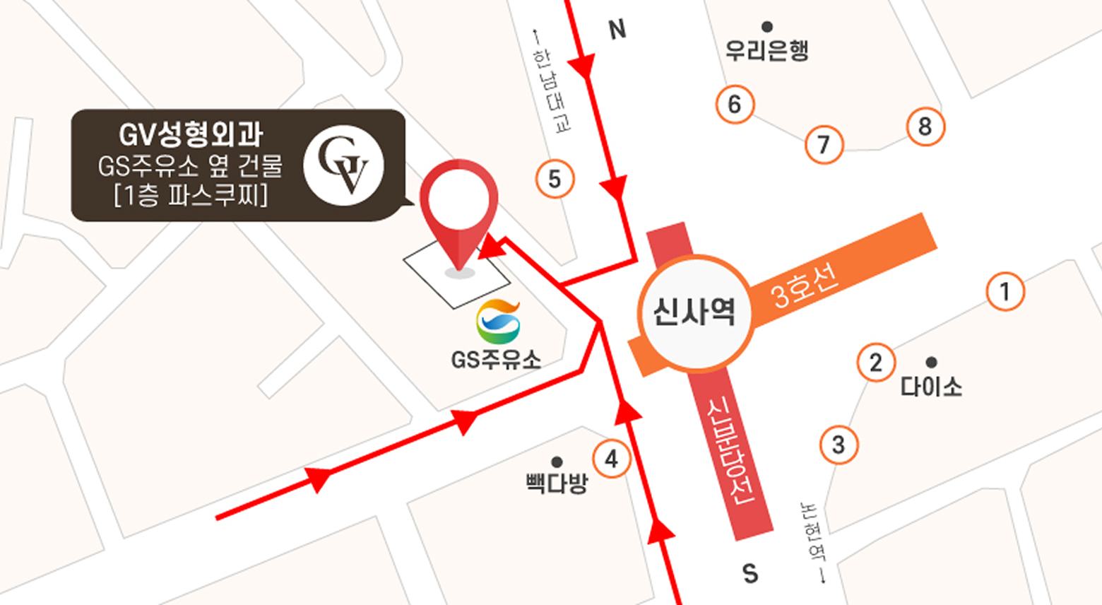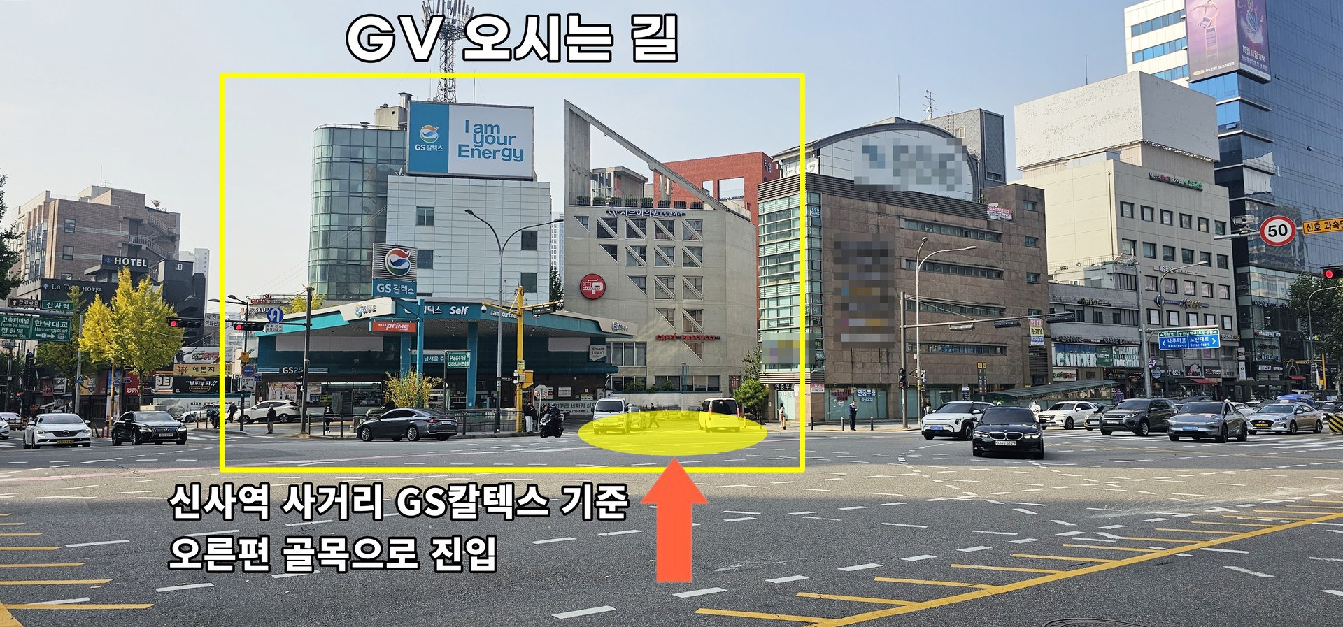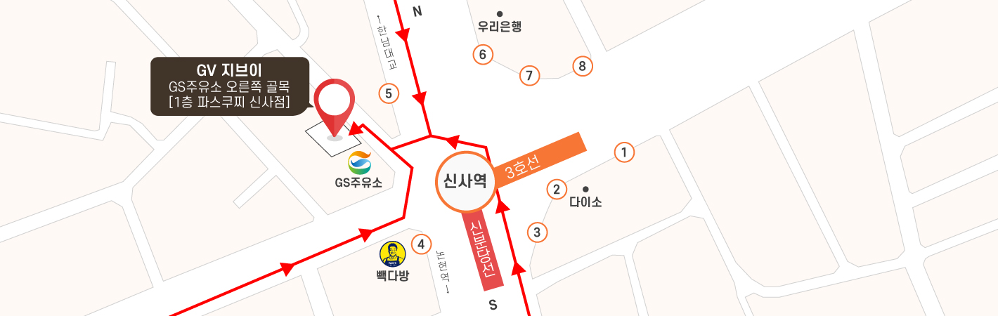GV는 신사역 GS칼텍스 주유소 오른편 골목에 위치하고 있습니다.