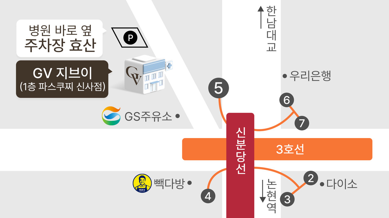 자가용 이용 시 GV성형외과 입구 오른편 효산주차장 이용